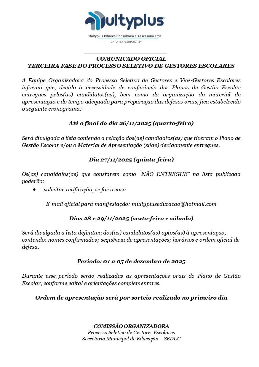 A Banca organizadora torna pública a lista oficial de candidatos(as) classificados(as) para a etapa de apresentação do Plano de Gestão Escolar (PGE), bem como o cronograma completo das apresentações, conforme previsto no Edital nº 001/2025 da Secretaria Municipal de Educação.