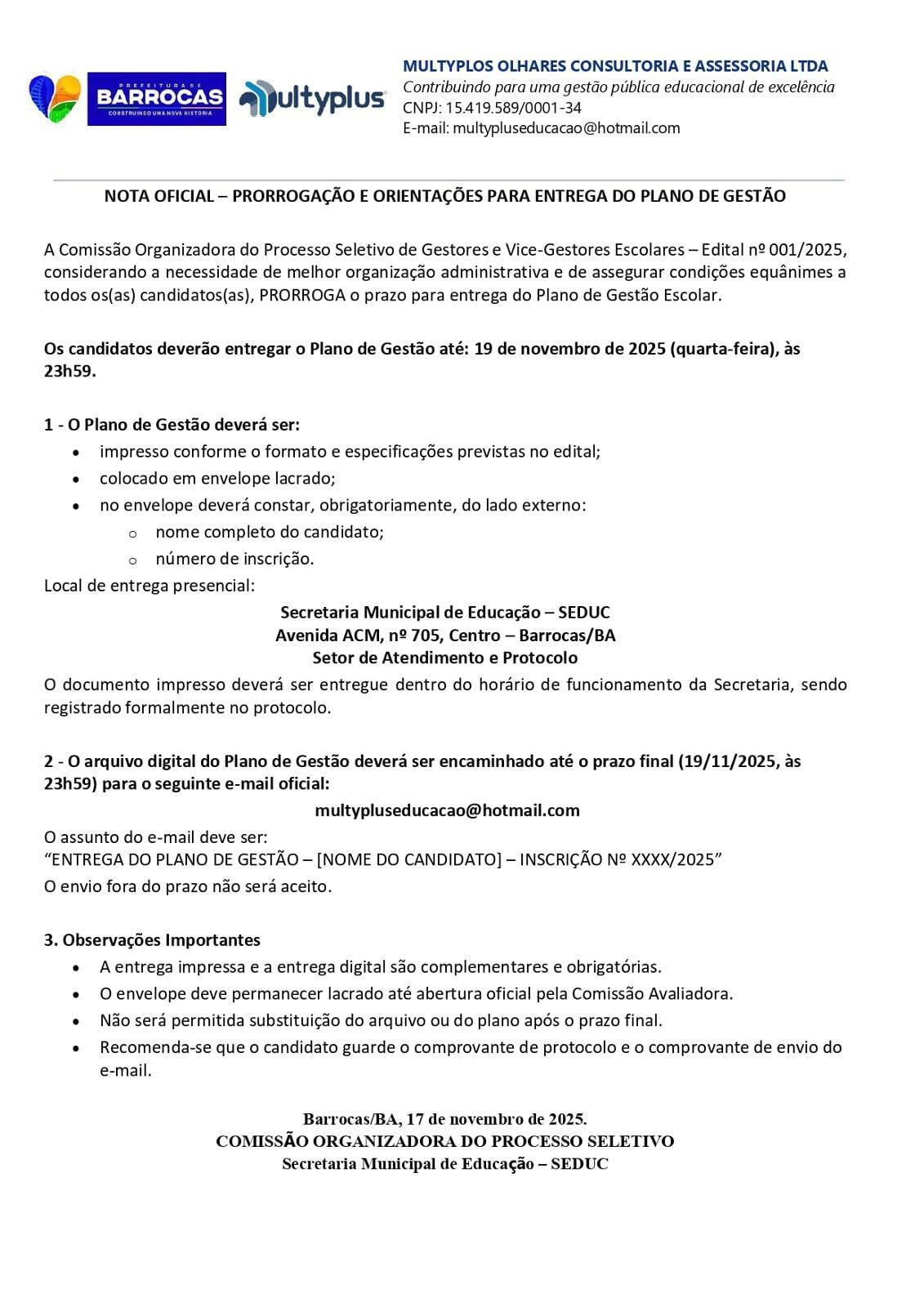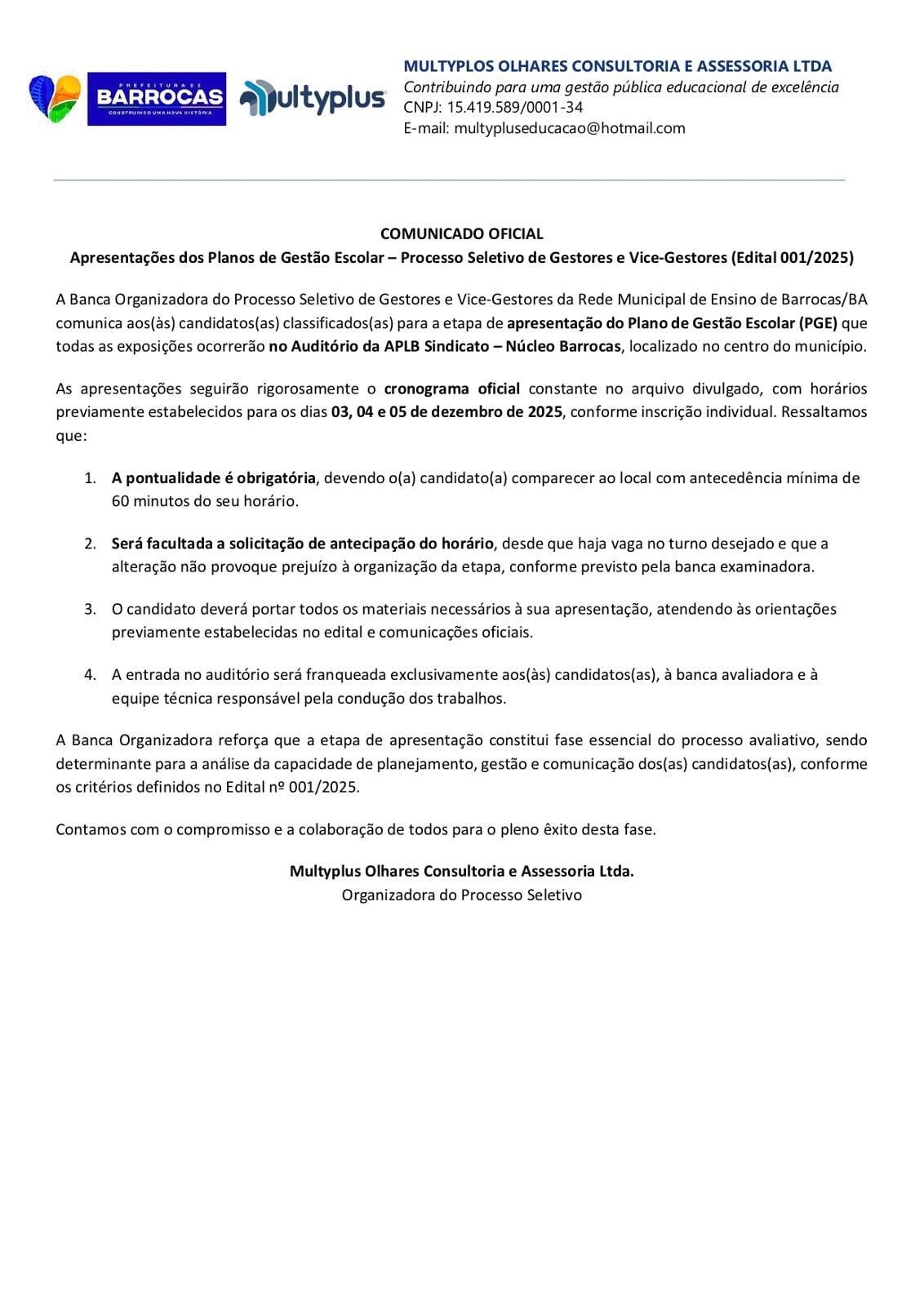 A Banca Organizadora do Processo Seletivo de Gestores e Vice-Gestores do Sistema Municipal de Ensino de Barrocas/BA informa que foi finalizada a fase de Apresentação do Plano de Gestão Escolar, conforme cronograma e disposições no Edital nº 001/2025.